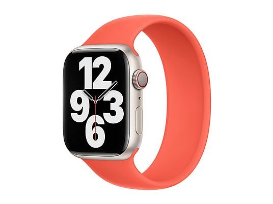 Dit solobandje van Apple is een bandje zonder gesp of sluiting. Hierdoor is het bandje rekbaar en heeft het geen overlappende delen. Het bandje is gemaakt van vloeibaar silicone, wat ervoor zorgt dat het bandje comfortabel aanvoelt. De speciale UV-behandeling zorgt ervoor dat het bandje glad aanvoelt.