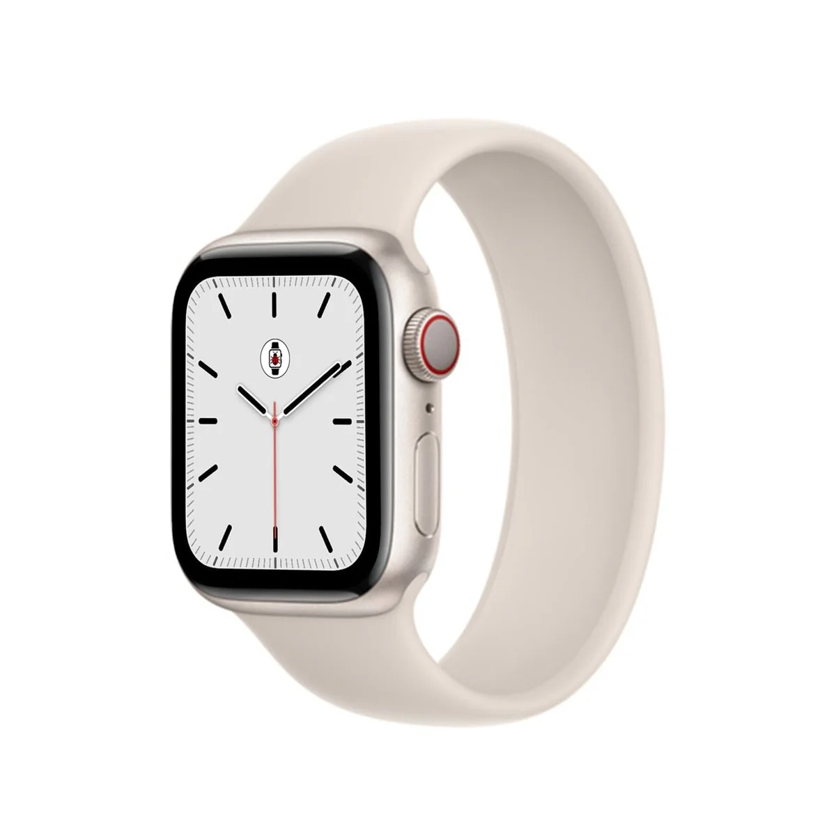 Dit solobandje van Apple is een bandje zonder gesp of sluiting. Hierdoor is het bandje rekbaar en heeft het geen overlappende delen. Het bandje is gemaakt van vloeibaar silicone, wat ervoor zorgt dat het bandje comfortabel aanvoelt. De speciale UV-behandeling zorgt ervoor dat het bandje glad aanvoelt.